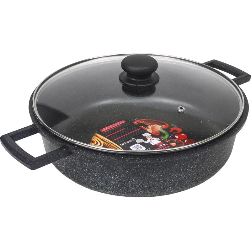 Жаровня предназначена для приготовления разнообразных блюд, таких как запеканки, тушёные овощи, мясо и птица. Она идеально подходит для использования как на плите, так и в духовке, что делает её универсальным помощником на кухне. Благодаря высоким бортам и удобной конструкции жаровня позволяет готовить блюда с минимальным количеством масла, сохраняя их натуральный вкус и полезные свойства. <br><br>Преимущества: <br>1. Благодаря большому диаметру (28 см) и объёму (4 л), в ней удобно перемешивать. Жаровня безупречно подходит для тушения и томления. <br>2. В комплект входит стеклянная крышка, точно подходящая по размеру к жаровне. Для правильной циркуляции воздуха на ней есть паровыпускное отверстие. Крышка снабжена пластиковой ручкой, которая не нагревается. <br>3. Удобные литые алюминиевые ручки, расположенные по бокам жаровни, благодаря материалу изготовления никогда не сломаются. Посуда имеет высокую стойкость к деформациям и внешним повреждениям. <br>4. Лёгким движением руки снимите крышку с жаровни, и она превратится в удобную посуду для запекания. <br>5. Стенки у жаровни высокие (8 см) и толстые: они лучше распределяют тепло, позволяют использовать разные температурные режимы с наибольшим эффектом и предотвращают попадание частичек еды за пределы жаровни, что позволит надолго сохранить чистоту кухни. <br>6. Толщина дна жаровни составляет 5 мм, что исключает деформацию корпуса жаровни, гарантирует её долговечность, идеально распределяет нагрев по всей поверхности, обеспечивая длительное сохранение тепла, благодаря чему еда не пригорает и равномерно доходит до готовности. <br>7. Жаровня произведена из литого алюминия. Литой способ — это лучший метод на рынке производства посуды на сегодняшний день, что говорит о долговечности посуды, гарантируя прочность и качество. <br>8. Безопасное пятислойное усиленное антипригарное покрытие, не содержащее PFOA и PTFE, нанесено методом напыления, которое во много раз лучше покрытий по методу «наката», сохраняет антипригарные свойства на долгие годы и не выделяет вредных веществ. Посуда, произведённая методом напыления, служит намного дольше. <br>9. Жаровню можно мыть в режиме «Эко» в посудомоечной машине. <br>10. Подходит для использования на газовых и электрических плитах, на стеклокерамических, газовых варочных поверхностях, в том числе на галогенных конфорках. Не подходит для индукционных плит. <br>11. Мраморный чёрный цвет будет отлично смотреться на фоне любого интерьера. Благодаря цвету жаровня даже после многократного использования будет долго выглядеть как новая. <br><br>Перед первым использованием удалить все этикетки и упаковочные материалы, тщательно вымыть посуду тёплой мыльной водой и тщательно ополоснуть, смазать всю внутреннюю поверхность тонким слоем растительного масла. Не нагревать пустую посуду, не подвергать горячую посуду резкому охлаждению, недопустимо скольжение посуды по рабочей поверхности плиты и стола. Во избежание царапин ставьте посуду только на чистую плиту. Во время приготовления избегайте попадания соли или сахара на поверхность плиты. Рекомендуется использовать практичные кухонные приборы из силикона и дерева, которые способствуют продлению срока службы посуды.