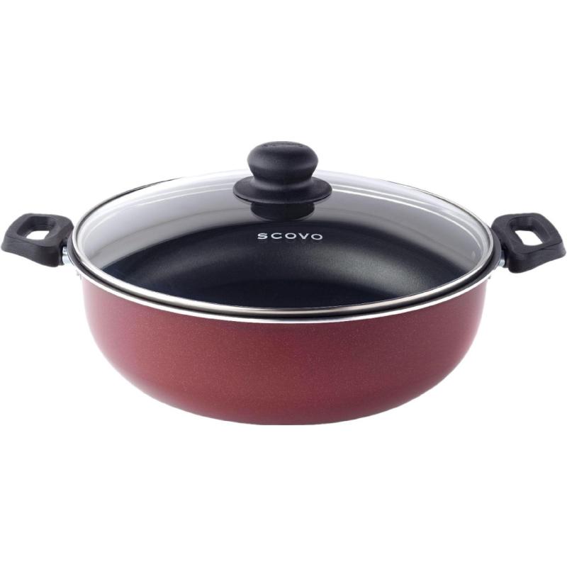 Жаровня Scovo 26 см 3.5 л алюминий (СЭ-013).<br>Жаровня диаметром 26 см и объёмом 3.5 л выполнена из штампованного алюминия.<br>Толщина стенки 1.8 мм, толщина дна 1.8 мм, высота 8 см. <br>Внутри антипригарное чёрное покрытие, снаружи жаростойкое бордовое лаковое покрытие.<br>В комплекте с жаровней идёт стеклянная крышка с бакелитовой бабышкой. Ручки бакелит.<br>Изделие подходит для всех типов плит, кроме индукции. <br>Можно мыть в посудомоечной машине. <br>Использовать в духовке не рекомендуется.