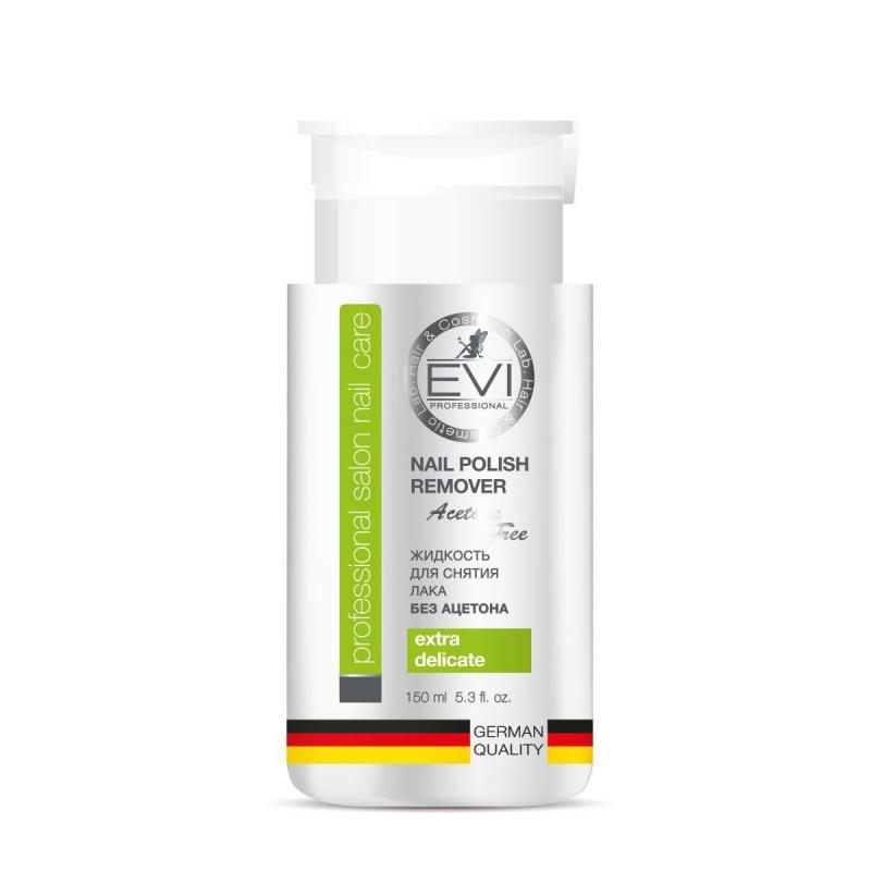 Жидкость для снятия лака EVI professional без ацетона с помпой-дозатором 150 мл<br><br>Идеально мягкое удаление лака. Специальный состав жидкости на базе метиллацетата мягко, эффективно и бережно удаляет маникюрный лак, без повреждения структуры ногтей. Благодаря ухаживающим компонентам в составе не иссушает ногтевую пластину, не оставляет разводов и белого налёта на ногтях. Обладает приятным ароматом, укрепляет ногтевую пластину и подходит для регулярного применения. <br><br>Свойства: <br>— не содержит ацетон; <br>— эффективно и бережно удаляет маникюрный лак, без повреждения структуры ногтей; <br>— не оставляет разводов и белого налёта на ногтях; <br>— укрепляет ногтевую пластину и подходит для регулярного применения; <br>— без эффекта «стянутости ногтя». <br><br>Преимущества: <br><br>— изготовлено с заботой о безопасности;<br>— не содержит красители, продуктов нефтехимии; <br>— в состав каждого продукта входят натуральные масла и экстракты растений, специально подобранные для решения специфических проблем разных типов ногтевой пластины, кожи рук и ног; <br>— приятный запах, что немаловажно.