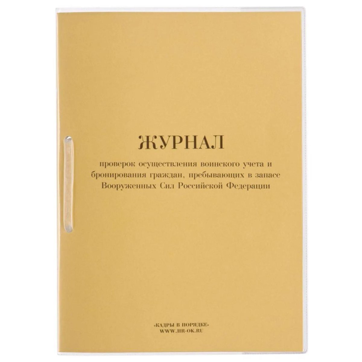 Журнал проверок осуществления воинского учета и бронирования граждан, пребывающих в запасе Вооруженных Сил Российской Федерации применяется для внесения сведений о проверках, выявленных нарушениях и предписаниях об устранении выявленных нарушений. Журнал соответствует требованиям «Инструкции об организации работы по обеспечению функционирования системы воинского учета» (утв. приказом Министра обороны РФ от 22 ноября 2021 г. N 700). Приложение 29. Обязательного к исполнению с 08.02.2022 и требованиям «Методические рекомендации по ведению воинского учета в организациях» (2017), утвержденные Генштабом Вооруженных Сил РФ 11.07.2017.<br>Журнал содержит следующие графы:<br>1. Дата проверки;<br>2. Должность, фамилия, инициалы проверяющего;<br>3. Результаты проверки, основные недостатки и выводы (оценка за качество осуществления воинского учета);<br>4. Решение руководителя организации по результатам проверки.<br>5.Отметка об устранении выявленных недостатков.<br>Журнал учета прошнурован, пронумерован, опломбирован номерной голографической пломбой. Журнал «Кадры в порядке» формата A4 (210×288 мм). Внутренний блок — офсетная белая бумага, плотность бумаги 80 г/кв.м, 32 листа. Обложка — золотистый картон. Дополнительно съемная обложка из прозрачного ПВХ.