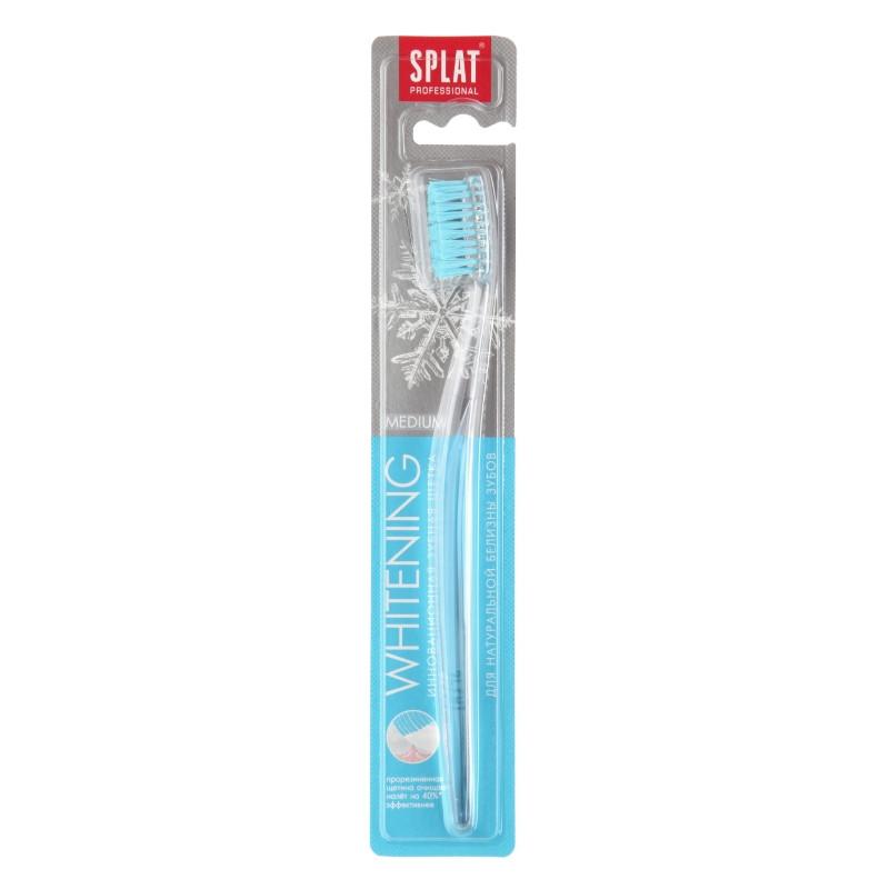 Зубная щётка Splat Whitening средней жёсткости<br><br>Прорезиненная щетина зубных щёток Whitrning на 40% эффективнее отбеливает зубы, чем обычная нейлоновая, что подтверждено клиническими исследованиями. Специальное покрытие каждой щетинки позволяет аккуратно и эффективно очищать налёт, как будто ластик стирает карандаш с белого листа бумаги. Закруглённые кончики щетинок гарантируют, что процесс чистки будет безопасным. Зубные щётки Splat Whitrning созданы для достижения снежно-белого оттенка зубной эмали, именно поэтому снежинка является символом серии.<br><br>Товар поставляется в нескольких вариантах цвета/дизайна (без возможности выбора).